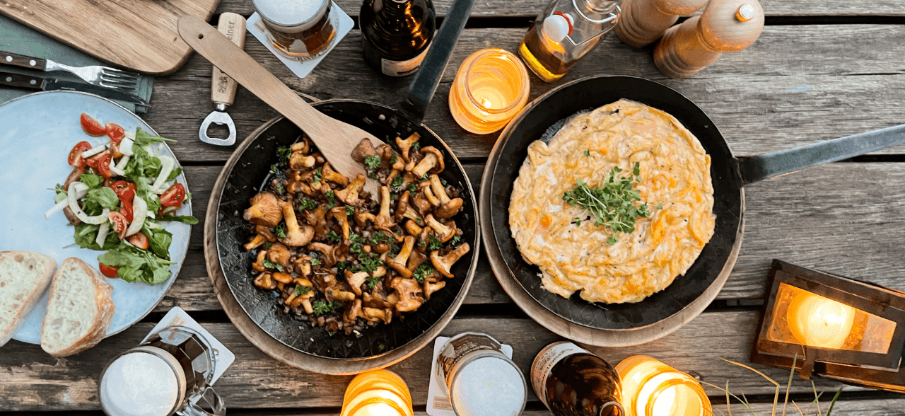 Pfifferling-Pfanne mit Rührei und Baguette