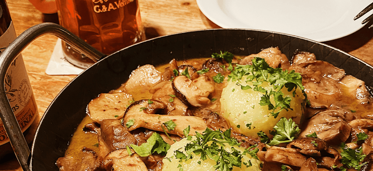- Die Pilze und Zwiebeln mit ¼ l Landbier ablöschen.