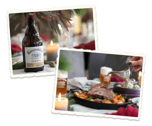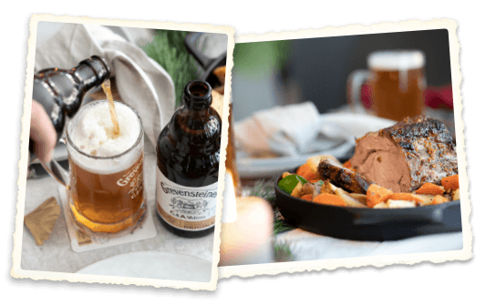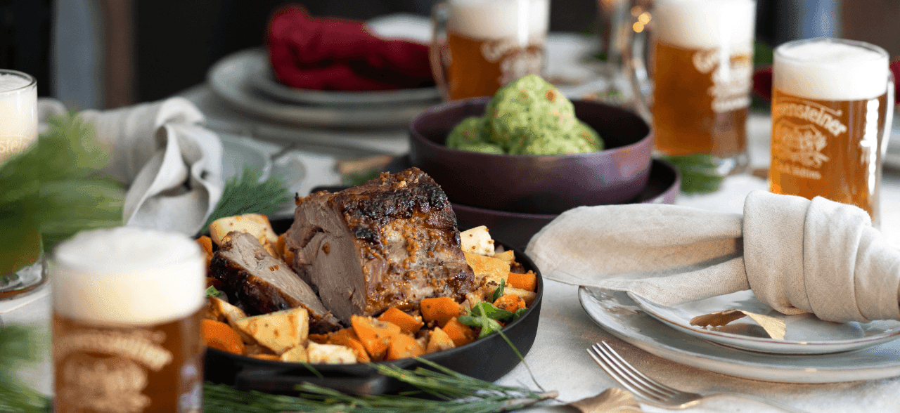 Schweinebraten zeichnet sich vor allem durch seine Deftigkeit aus. So wird oft passend dazu Bier gereicht, die Kombination ist bewährt. Noch raffinierter wird das Aroma, indem man - wie bei unserem Rezept - das Bier direkt in die Marinade einarbeitet. Durch die süß-karamelligen Noten im Grevensteiner Landbier wird der Braten auf neues Level gehoben. Um die Süße auszubalancieren werden neben Senf in der Marinade auch besonders erdige Gemüsesorten wie Selleriewurzel und Karotten gereicht. Für den Farbklecks auf dem Weihnachtstisch sorgen leuchtend grüne Spinatknödel.
