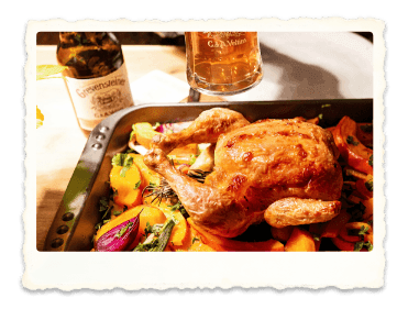 - Anschließend den Bräter auf einem Holzbrett servieren und dazu zwei gut gekühlte Grevensteiner Landbiere einschenken.
